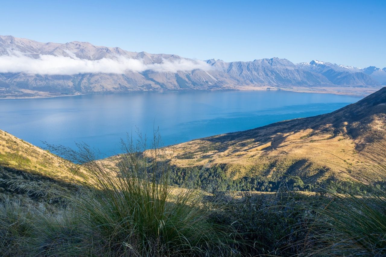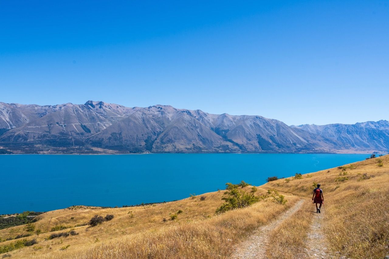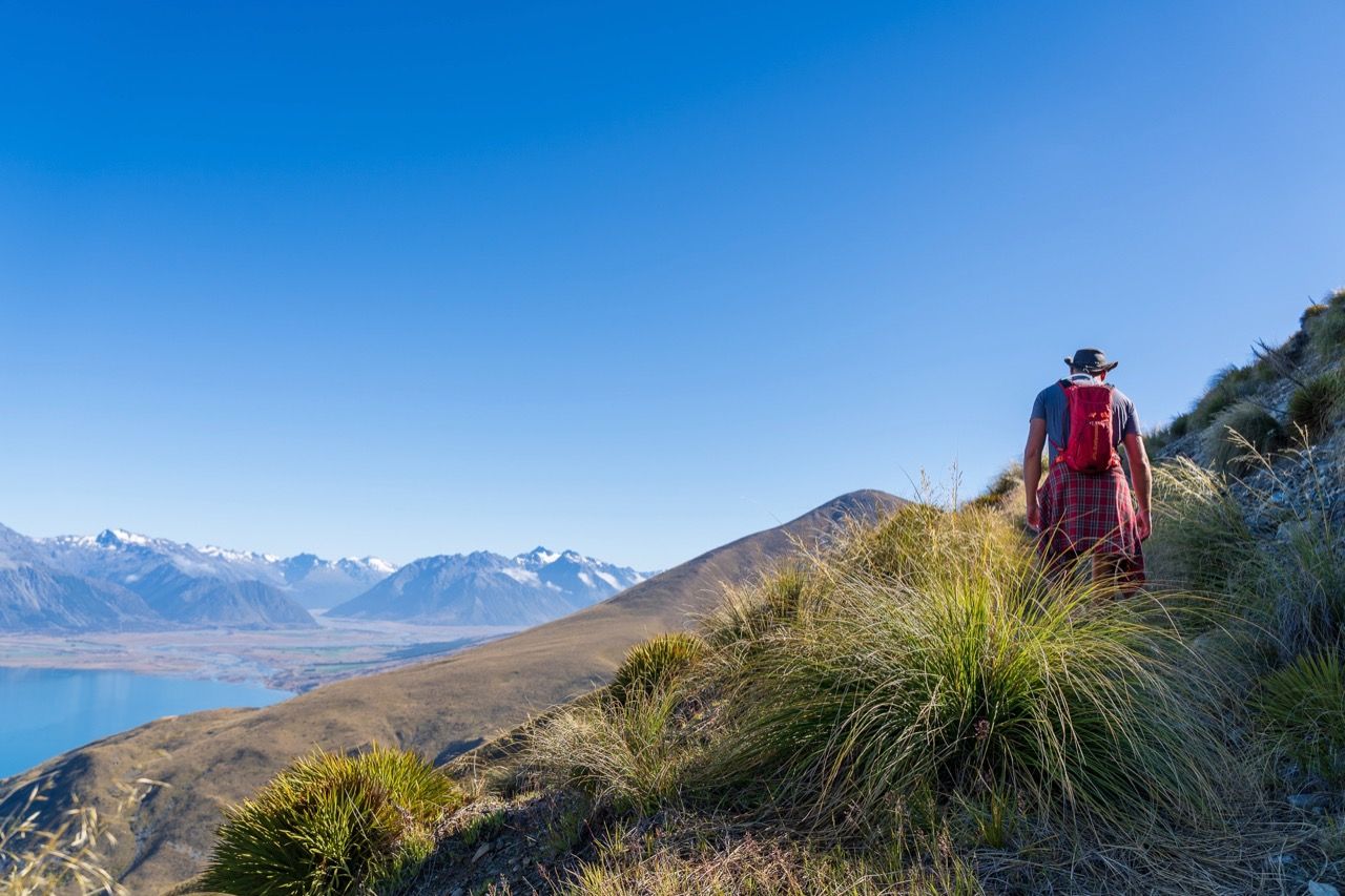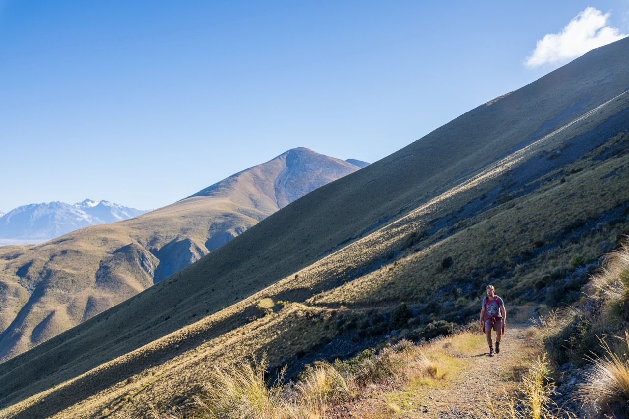 The trailhead is located approximately 22 kilometres from Twizel township, along Glen Lyon Road on the north side of Lake Ōhau. Starting from the car park, you immediately pass an old derelict musterer’s hut from the 1890s called Back Hut. From there, it’s a five-kilometre climb up the western flank of Ben Ōhau/Ruataniwha Peak. To find the true summit at 1522m, you will need to deviate from the trail and pick your own trail to the top.